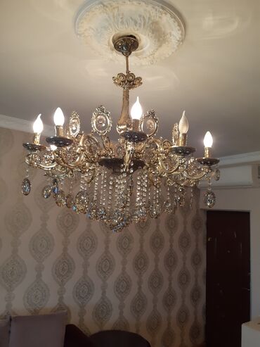 Klasik kristal çilçıraq - Material: metal gövdə və şəffaf kristal dekor elementləri - Dizayn: çoxşaxəli konstruksiya, hər şaxənin ucunda şam formasında lampa yuvası; kristal prizmalar və asqılarla...
