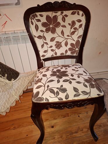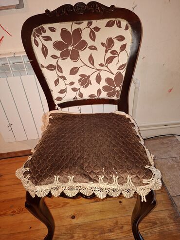 - Stullar (2 ədəd görüntüdə): Tünd ağac çərçivə, bel hissəsində oyma naxışlar, önə doğru yüngül əyri ayaqlar. Oturacaq və bel hissəsi naxışlı parça üzləmə ilə. İstəyə görə dekorativ oturacaq yastığı ilə istifadə oluna bilər.