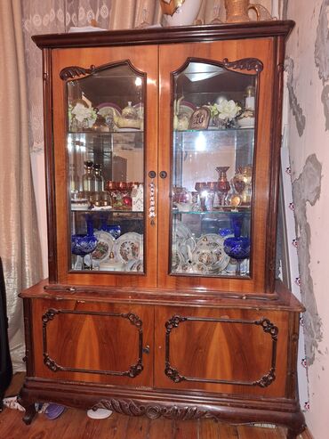 - Kredens/vitrin: Üst hissəsi şüşəli iki qapılı vitrin, içəridə güzgülü arxa panel və şüşə rəflər. Alt hissədə iki qapılı bağlanan bölmə. Ağac karkas, qapılarda oyma dekor, dalğalı karniz və dekorativ ayaqlar. Serviz, bəzək əşyaları və kitablar üçün geniş saxlama imkanı.