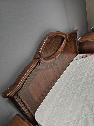 Klassik üslubda taxta yataq dəsti - Material: tünd rəngli massiv ağac (dekorativ oyma detalları və relyef işləmələr) - Yataq: iri ölçülü, hündür arxalıq, yumşaq xətli ön panel; ortada bəzək medaly...