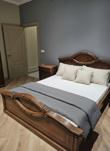 Yataq otağı dəsti – modern dizayn, açıq boz tonlarda Komplektə daxildir: - 160x200 sm ölçülü rahat çarpayı (yumşaq başlıq, taxta əsaslıq) - 2 ədəd tumbə (yan şkafça) - 4 qapılı qarderob: iki aynal...