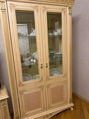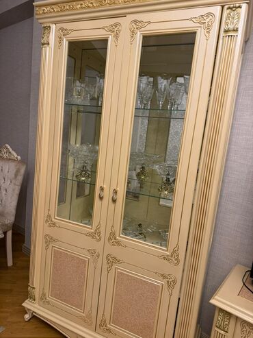 - 2 ədəd ikiqapılı vitrin şkafı: şüşə ön qapılar, içəridə güzgülü arxa panel və bir neçə şüşə rəf; aşağı hissədə qapalı bölmə
