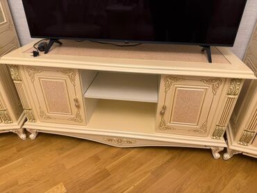 - 1 ədəd TV stendi: yuxarıda geniş televizor yeri, ortada açıq rəf bloku (2 səviyyə), sağ-sol tərəfdə qapalı bölmələr; dekorativ ayaqlar və frezli ön hissə