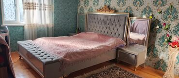 - Geniş iki nəfərlik çarpayı – hündür, düyməli (kapitone) yumşaq başlıq, qızılı ornamentli tac, ön hissədə oturacaq tipli puflu skameyka ilə