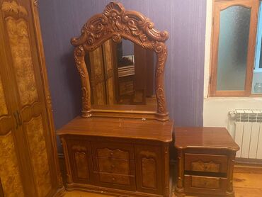 - Tualet masası və böyük dekorativ çərçivəli güzgü: yanlarda qapalı bölmə, ortada bir neçə çekmece.