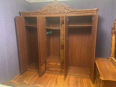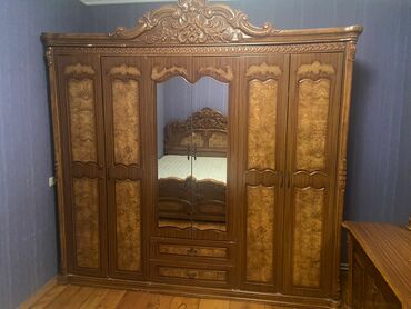 - 6 qapılı geniş qarderob: mərkəzdə iki ətək güzgülü qapı, içəridə asılqan bölmələri, yuxarı rəflər və aşağıda 3 çekmece.