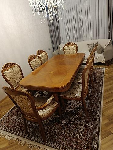 - Tərkibi: 1 böyük düzbucaqlı masa + 6 stul (2 ədəd qolçaqlı, 4 ədəd qolçaxsız).