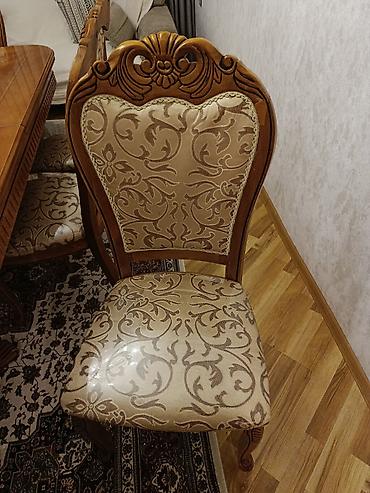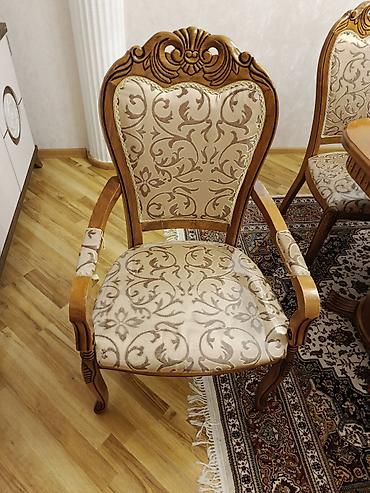 - Material: Bərk ağac karkas, laklı taxta üstlük; yumşaq oturacaq və bel hissəsi. Parça – krem rəngdə, qızılı naxışlı döşəmə.