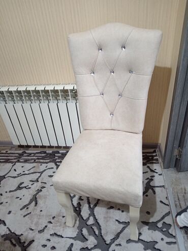 - Stul(lar): Krem rəngli yumşaq parça üzlük. Yüksək bel hissəsi romb tikişli “kapitone” işləmə və bəzək düymələri ilə. Qabarıq, rahat oturacaq. Klassik formalı ağ/krem rəngli ayaqlar.