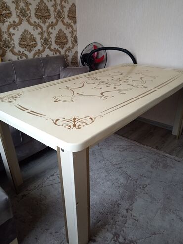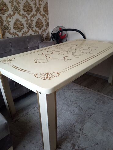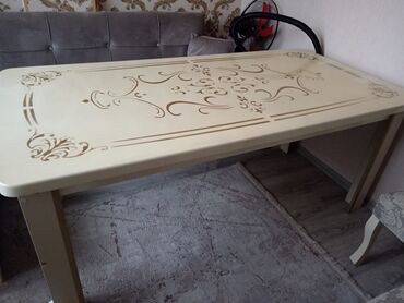- Masa: Krem rəngli səth, qızılı ornament naxışlarla bəzədilmiş. Düzbucaqlı forma, yumru künclər. Dörd möhkəm ayaq, masa üstü eni boyunca dekorativ haşiyə. Otağa nəzakətli görünüş verən parlaq səth.