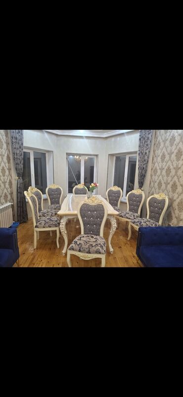 Zövqlü klassik interyerlər üçün tam uyğun, geniş məclislər və ailə süfrələri üçün rahat oturma sayı ilə. Rəng uyğunluğu mavi və krem tonlu salonlarla ideal harmoniya yaradır.