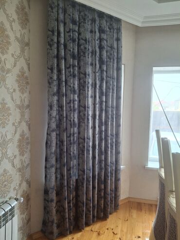 - Pərdə (şəkildə): mavi-boz tonlarda, qalın material, döşəməyədək uzunluq, sıx pliseli