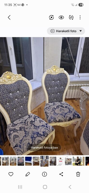 - Stullar: yüksək arxalı, başlıq hissəsində qızılı ornament; arxa hissə düyməli kapitone; oturacaq və arxa hissə mavi-boz naxışlı parça ilə üzlənib