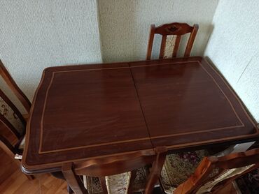 - Material: bərk ağac karkas, tünd qəhvəyi şpon örtüklü masaüstü; stullarda taxta karkas və naxışlı parça oturacaq/arxa hissə