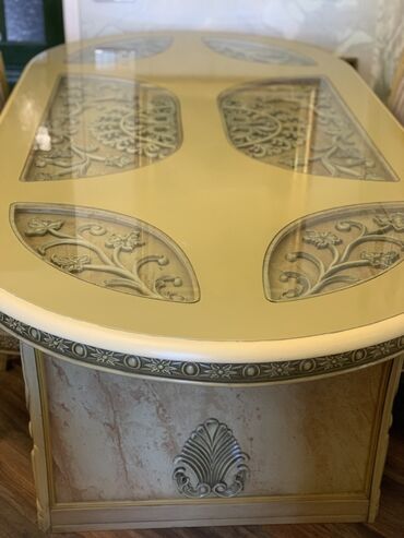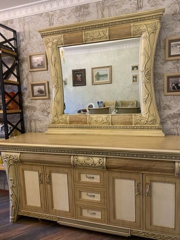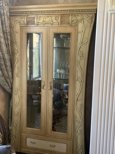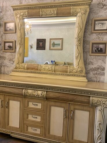 Qonaq otağı mebel dəsti - Üslub: müasir, iki rəngli kombinasiya (açıq krem və qoz rəngi), dekorativ dairəvi tutacaqlar. - Tərkib: 1) Komod – sağ/sol hissəsi fərqli rəngdə, 4 geniş çekmece; üstü ...