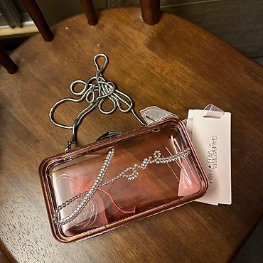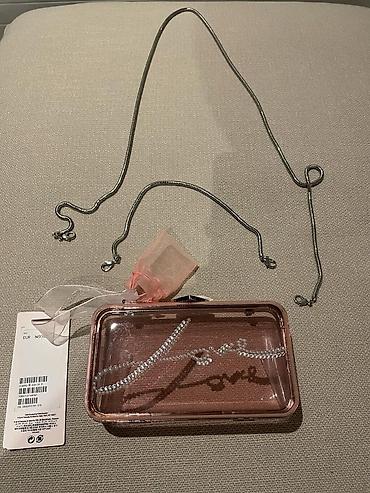 - Şəffaf çəhrayı, sərt korpuslu mini çanta/clutch: ön hissəsində kristal daşlarla “Love” yazısı, metal çərçivə və kilid.