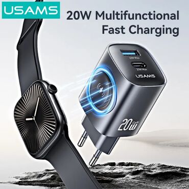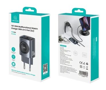USAMS T67 20W multifunksional şarj cihazı. Bu adapterin A+C portu var və iWatch üçün simsiz doldurma funksiyası mövcuddur. İki port vasitəsilə eyni anda bir neçə cihazı sürətli şəkildə şarj etmək imkanı verir. Kompakt dizaynı onu səyahət üçün əlverişli edir, həmçinin evdə və ya ofisdə rahat istifadə oluna bilər. Məhsul qəhvəyi rəngdədir. iWatch sahibləri üçün ideal bir şarj cihazıdır.
