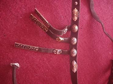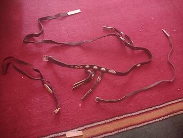 Əl İşləməli Kəmər – metal bəzəkli, milli üslub - Material: qalın təbii dəri - Bəzəklər: kəmərin bütün uzunluğu boyu rellefli metal nişanlar; ulduz və xaçvari ornamentlər, şərq naxışlı iri metal pl...