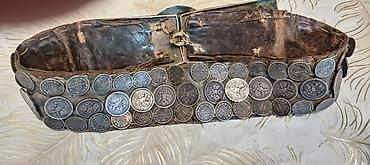 - Material: qalın dəri əsas, üzəri sıx şəkildə qədim gümüş sikkələrlə işlənib.