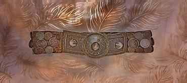 Gümüş naxışlı kəmər - Material: gümüş rəngli metal lövhəciklər və dəri əsas - Dizayn: hər bir hissəsi üzərində əl işi kimi görünən şərq üslublu oyma-naxışlar; modullu (birləşdirilmiş) seqmentlərdə...