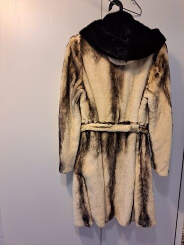 - Rəng və naxış: Krem/bej əsas ton üzərində tünd qəhvəyi-şokolad zolaqlı effekt; böyük tünd (qara) xəz yaxalıq
