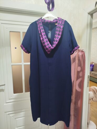 Markenz qadın donu - Ölçü: 46 (etiketdə göstərilib) - Rəng: tünd göy - Model: düz kəsim, qısa qollu - Yaxa: dairəvi, ikiqat bəzək lentləri ilə (açıq çəhrayı üzərində tünd göy xallı) - Bəzək: ətəyi...