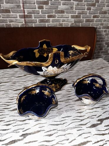 - 1 böyük ayaqlı qab: dalğalı kənarlar, qızılı haşiyə, çiçək və ornament motivləri
