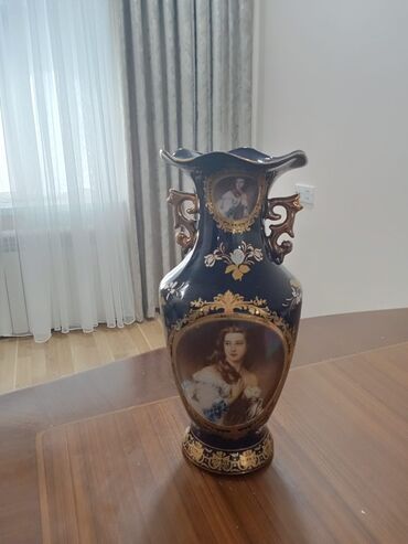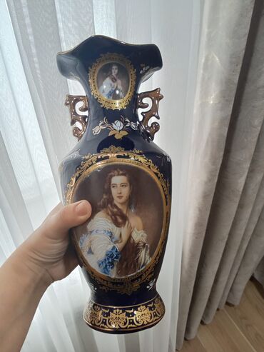 Zərif dekorativ vaza - Material: porselen/keramika - Rəng: dərin tünd göy-qara fon - Üzərində qızılı naxışlar və relieflər - Hər iki tərəfdə portret miniatürləri (oval medalyon çərçivələrində) - Y...