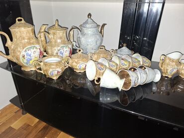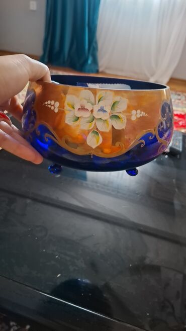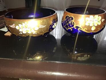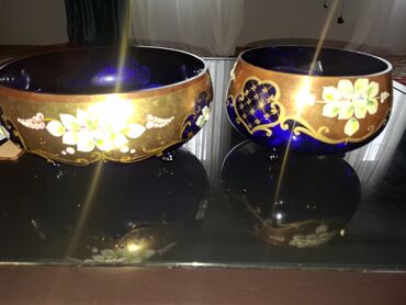 Şəkillərdə ayrıca çay dəsti də görünür; bu elan kobalt mavi-qızılı naxışlı 2 şüşə kasaya aiddir.