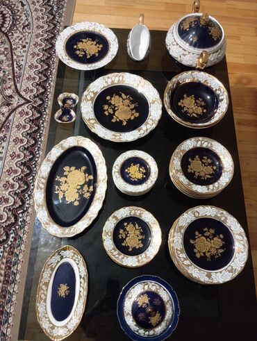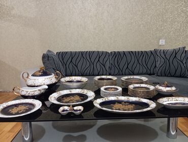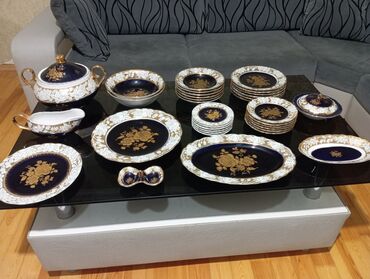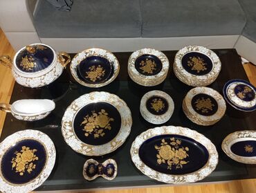 Kobalt-mavi və qızılı naxışlı porselen süfrə dəsti