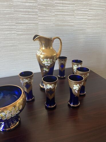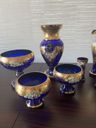 Hamısı birlikdə 100m Kobalt mavi şüşədən dekorativ qab və vaza dəsti - Tərkib: 1 ədəd vaza və 5 ədəd ayaqlı dekorativ qab - Material: qalın kobalt mavi şüşə - Bəzək: əl işi qızılı naxışlar, relye...