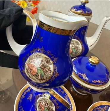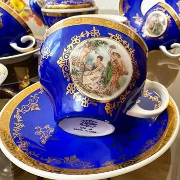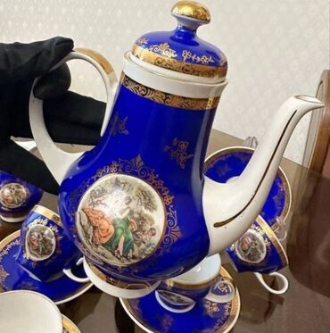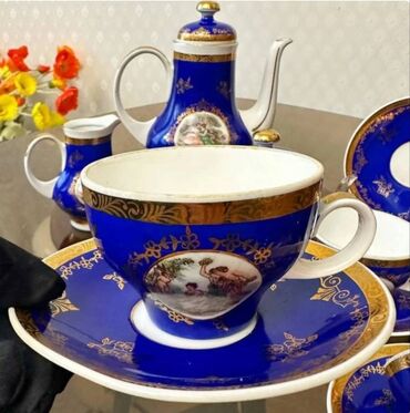 Porselen qəhvə/çay dəsti – klassik üslub, kobalt-mavi və ağ rənglərin harmoniyası, qızılı naxış və haşiyələr. Dəstdə romantik rəsmli medalyonlar var. Komplekt: - 1 böyük çaydan/qəhvədan (qızılı qu...