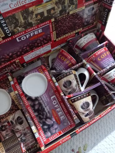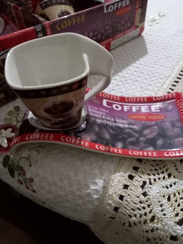 - Dizayn: fincan və boşqablarda kofe dənələri və fincan təsvirləri, kənarlarda “COFFEE” yazıları. Fincanlar erqonomik qulp və yuxarı hissədə yüngül kvadratvari formaya malikdir.