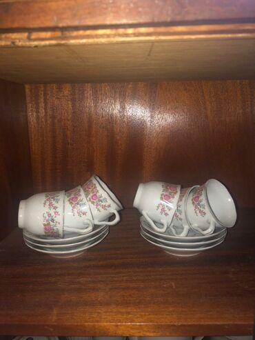 Mətbəx/qonaq süfrəsi üçün kolleksiya qab-qacaq və dekor dəstləri - Holland istehsalı “Muider Holland – printed in Holland” işarəli çay dəsti: qızılı haşiyəli, qızıl medalyonlu boşqablar, güllü nax...
