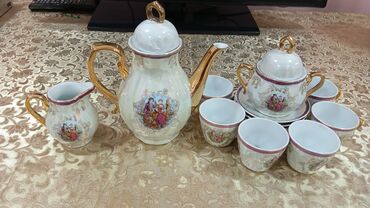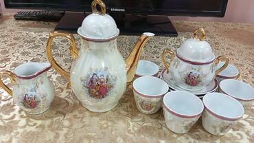 Gədim sovet gəhfə servizi,rusiyanın,bufetdə galıb,işlınməyib,6 fincan,6 nəlbəki, süd gabı, çaydan,bir dənə şəkər gabısı yoxdur,gırılıb ,heç bir sınığı,gırıntısı yoxdur 25man