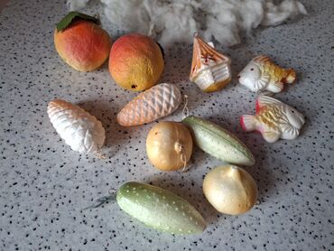 SSSR vaxtının Yolka oyuncaqları – vintage kağız-ması və pambıqdan hazırlanmış fiqurlar dəsti. 6 ədəd. - Formalar: qırmızı-ağ “göbələk” fiqurları və portağal tonlarında giləmeyvə/konus fiqurları. -...