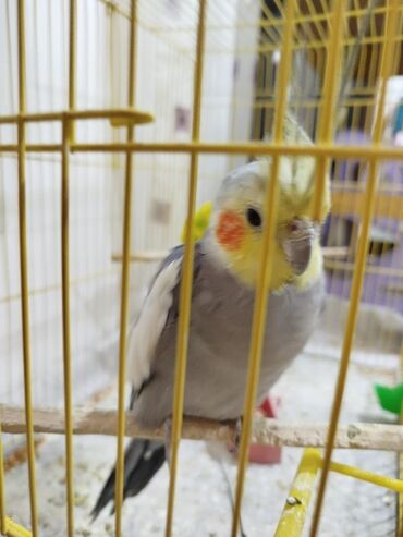 Nymfa (cockatiel) papağanı və qəfəs dəsti - Növ: Nymfa (kokatiel) – xallı boz bədən, sarı haşiyəli baş və narıncı yanaq ləkələri, uzun quyruq, başında çalqalı ibik - Xasiyyət: ev şəraitinə uyğun, ...