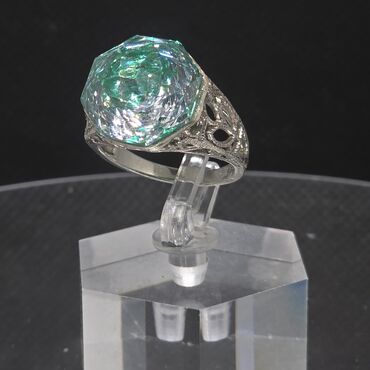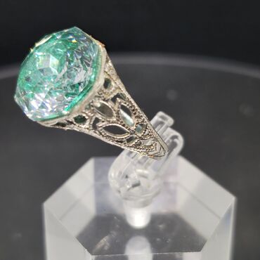 Art Deco üslubunda rəngli böyük daşlı üzük. Octagon ogranka ilə Üzüyün dizaynı zərif oyma naxışlarla bəzədilib. Bu üzük xüsusi günlər üçün gözəl seçim ola bilər.