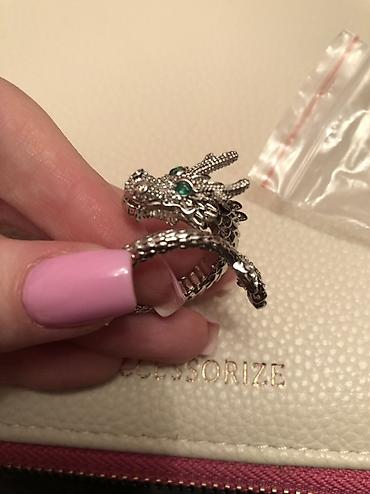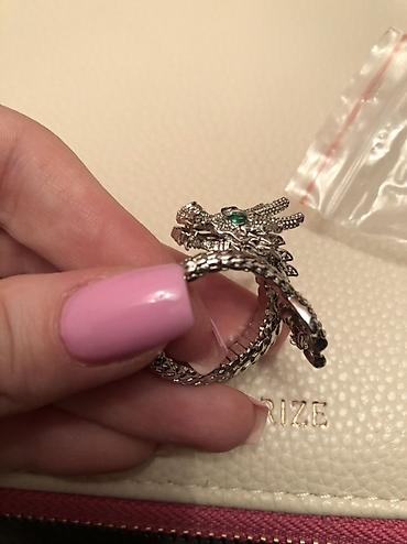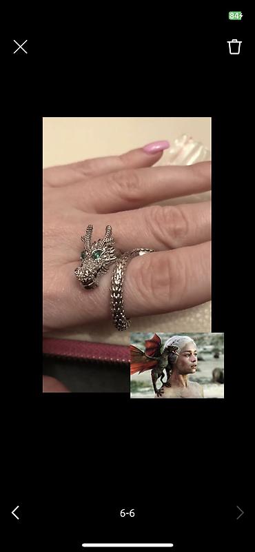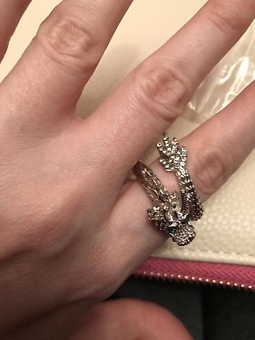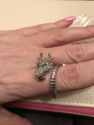 - Dizayn: üzüyün ön hissəsində detallı əjdaha başı, yaşıl rəngli daşlarla gözlər; bədən hissəsi pulcuqlu teksturalı lent kimi barmağı dolayır