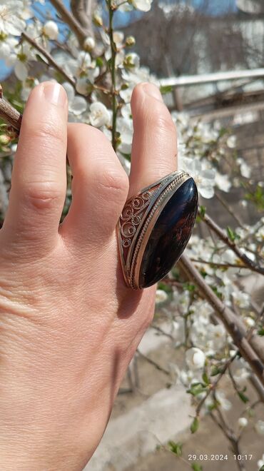 Aqat Kişi üzüyü – iri oval daşlı… - Material: metal korpus (gümüş tonlarında), yanlarda əl işi ornamental naxışlar - Qaş: iri, oval formalı, parlaq cilalı; süd-ağ fon üzərində xardal-sarı ləkəli t...