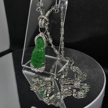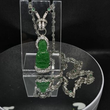 Möhtəşəm! Tek ekzemplyarda (nüsxədə)!gümüş 925prob dəst Rusiya istehsalı Tebii Jadeit qaslar – sırğa, üzük və kulondan ibarətdir - Dizayn: Yarpaq formalı parlaq ağ dag bülluru ve canli zümrüd rəngl...