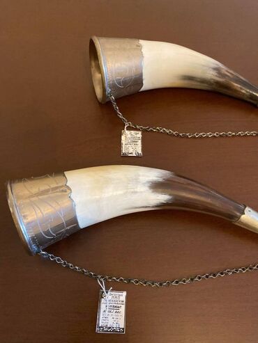 Эти изделия выполнены вручную из натурального рога с традиционной металлической отделкой, украшенной тонкой гравировкой. Каждый рог снабжён цепочкой для удобного размещения или ношения. Оригинальные заводские бирки с датой выпуска подтверждают подлинность и историческую ценность предмета.