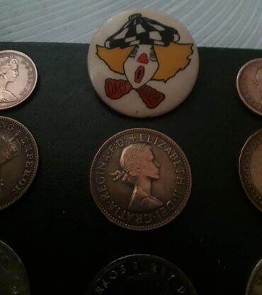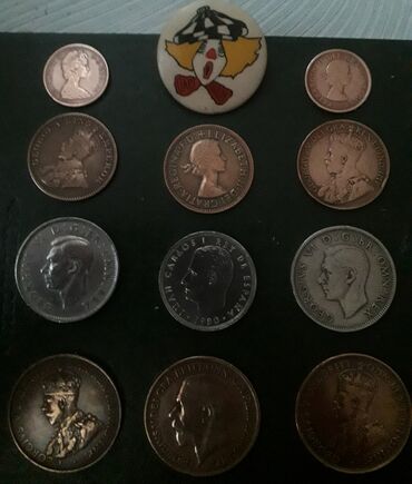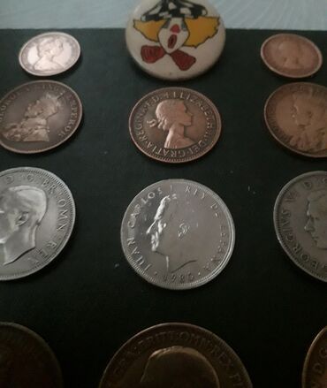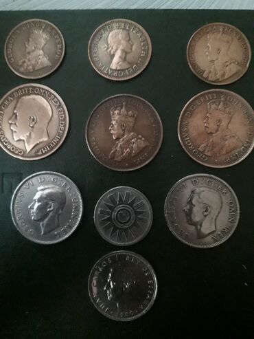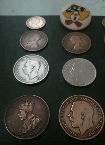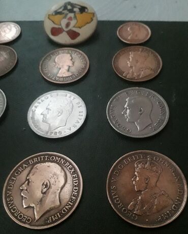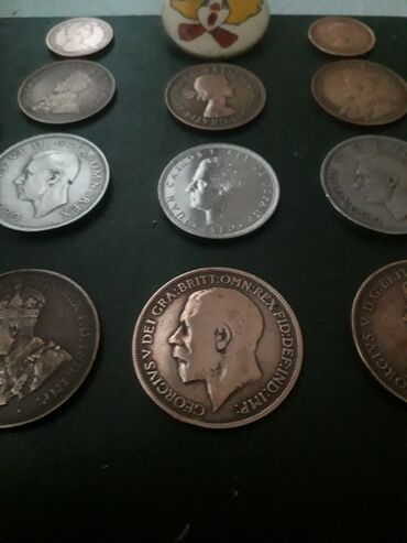- Britaniya monarxlarının təsviri olan müxtəlif ölçülü köhnə sikkələr dəsti. Üzərində “GEORGIVS V” və “GEORGIVS VI D.G. BR. OMN. REX” yazıları görünür; bəzilərində taclı portret, bəzilərində profil portretləri var.