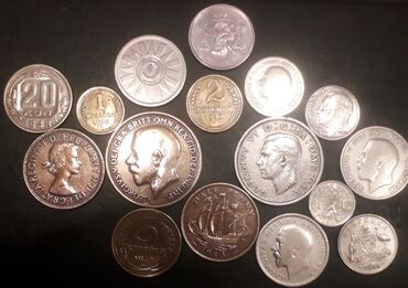 Məhsul: Kolleksiya sikkələri və nişan Təsvir: - Britaniya monarxlarının təsviri olan müxtəlif ölçülü köhnə sikkələr dəsti. Üzərində “GEORGIVS V” və “GEORGIVS VI D.G. BR. OMN. REX” yazıları görünür...