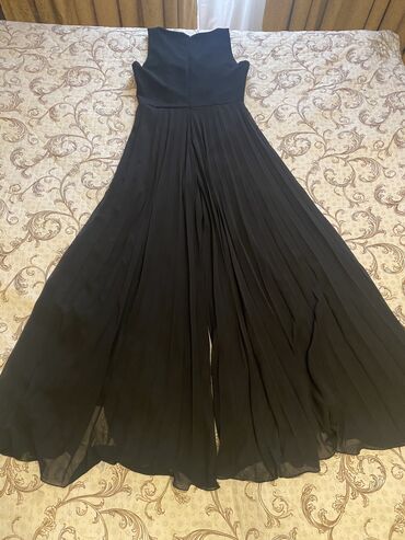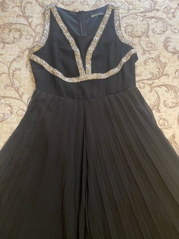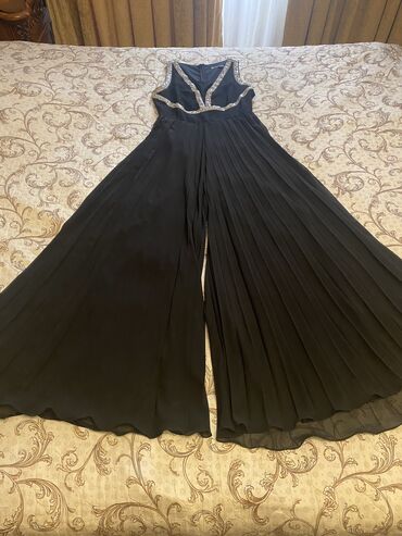 Qara rəngli kombinezon - Model: qısaqol, dairəvi yaxalı - Dizayn: üst hissəsi paltar görünüşlü, alt hissəsi geniş paçalı şalvar; - Material: axıcı, yüngül parça 1 dəfə geyinilib