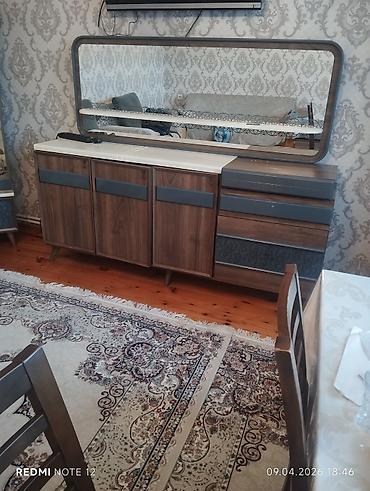 Klassik üslubda qonaq/yataq otağı üçün mebel dəsti Tərkibi: - Üstündə iri çərçivəli güzgü olan konsol/komod 30 manat - 3 bölməli böyük şkaf: ortada tam boy güzgülü qapı, yanda asılqan və rəf bölmə...