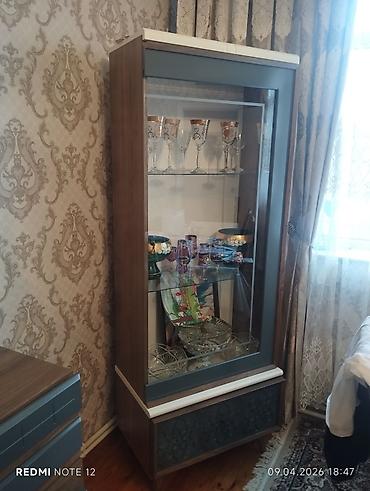 Qonaq otağı üçün mebel dəsti - Dəst tərkibi: • 2 qapılı şüşə vitrin (içəridə şüşə rəflər, üst hissə vitrin, alt hissə qapalı bölmə və iki dairəvi tutacaq) • Dar şüşə vitrin (yuxarı hissəsi vit...