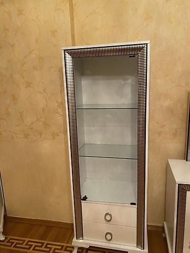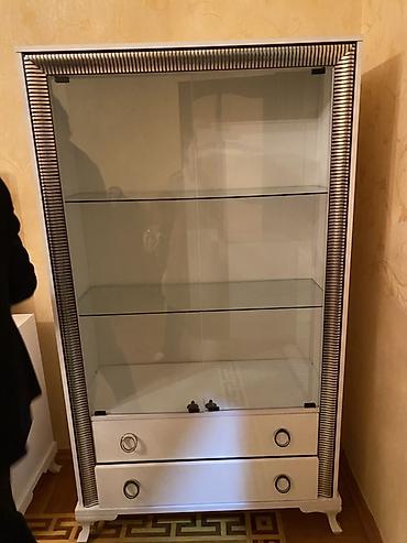 - Vitrin şkafı (2 ədəd): şüşə qapı, 2 şüşə rəf, aşağıda 2 ədəd dərin çekmece; perimetri relyefli gümüşü çərçivə ilə.