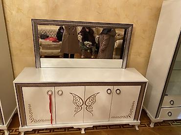 - Güzgülü konsol/komod: 4 qapılı bölmə, içdə geniş rəflər; ön paneldə dekorativ naxış; üstündə iri düzbucaqlı çərçivəli güzgü.