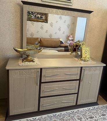 3) Geniş komod güzgü ilə – üst hissədə böyük, çərçivəli güzgü; aşağıda 4 geniş çekmece və hər iki tərəfdə qapalı dolab bölməsi; hamısında möhkəm metal tutacaqlar.